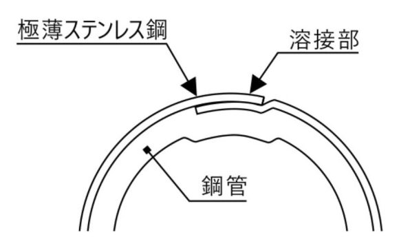 ・外被ステンレスの継ぎ目である溶接部分は完全に溶着されていると共に、内部の鋼管とも溶着されている為、一体化したパイプとして使用できオールステンレスパイプと比較して殆んど遜色ありません。